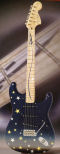 | Remarks: This guitar was built for the Summer 2005 NAMM show. The stars are made of white and yellow golf leaf. The bird's-eye maple neck is inlaid with an aluminium rocket with a "vapour trail". | ||