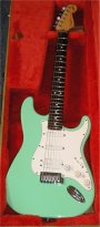 | Remarks: This colour is 'Surf Pearl' (a 1957 DuPont Chevrolet color). (Perhaps) visible modification is that the tuners have been replaced by Fender/Schaller locking tuners (like on the Deluxe Strat). | ||