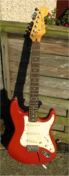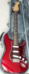 | Remarks: This colour is Hot Rod Red, a nitro-cellulose lacquer finish. The body is lightweight ash, contoured as in '57. It's got a '62's "C" shape maple neck, 21 nickel silver frets. It has 3 Texas Special pickups, 5-position switch, and Knopfler's signature decal on the ball of the headstock. | ||