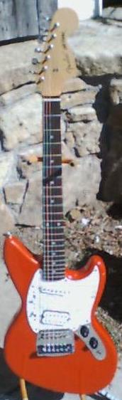 | The Jag-Stang was designed by the late Kurt Cobain of Nirvana. It's, basically, a cross between a the Jaguar and Mustang guitars. Arguably not the most aesthetically pleasing match, but there ya go. It used to be made exclusively by the US Fender Custom Shop (using a DiMarzio H-3 humbucker and a Fender Texas Special), but later got made in Japan. It's got a floating bridge, 22 frets, and each pickup has its own 3-position switch with one featuring an 'out of phase' mode. Maple neck, rosewood fingerboard. | |||