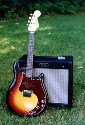 | Remarks: This is a 4-string, solid body electric mandolin by Fender. Also on the picture is a '64 Fender Champ Amp, black tolex. | |||