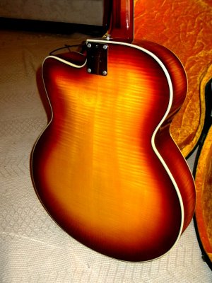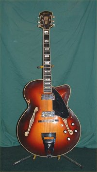 | Remarks: This beauty of an archtop has vintage sunburst finish. It's all original except for the ebony saddle, now replaced with a tunematic type adjustable saddle. Click here for a detail of the headstock. | ||