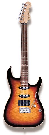 | Remarks: Alder body, figured maple carved top with scraped edges, set-in maple neck with abalone dot markers, rosewood fingerboard, Sperzel Trim-Lok tuners, LSR roller nut, two Fender "Fat 50's" single coil pickups and one Seymour Duncan '59 Trembucker, deluxe 2-point locking tremolo. | |||