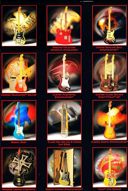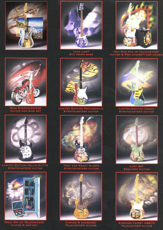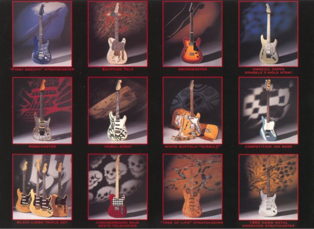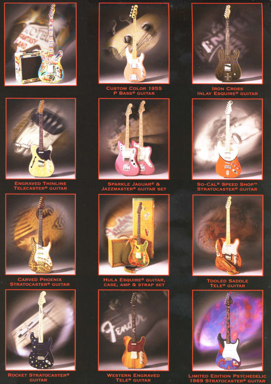 | Rittor Music (Japan), 1998, ISBN 4-8456-0279-2, 194 pp. This is a truly beautiful picture book with almost 90 custom colour, blonde and sunburst Stratocasters from 1954-1971 immortalized (with serial number, year of manufacture and close-up shots). This book really got my rocks off! There's not a lot of text, but most of that is in Japanese (serial numbers and years of manufacture are in Latin characters, though, and chapter and page headings are in English). There's also a lot of background on the study of Strats, some Strat-related interviews, pictures of all custom color charts and a lot of promotion/documentation reproduced.
