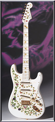 | Remarks: This guitar was specially made by the Custom Shop for Ernie Isley, one of the Isley Brothers. It was commissioned by his wife on occasion of her husband's birthday. George Amicay hand-carved the flame maple top, and also engraved a subtle rose in the headstock (look hard). The rosewood fingerboard has several inlaus as well, among which are a hummingbird and two doves. The guitar itself was built by Art Esparza. | ||