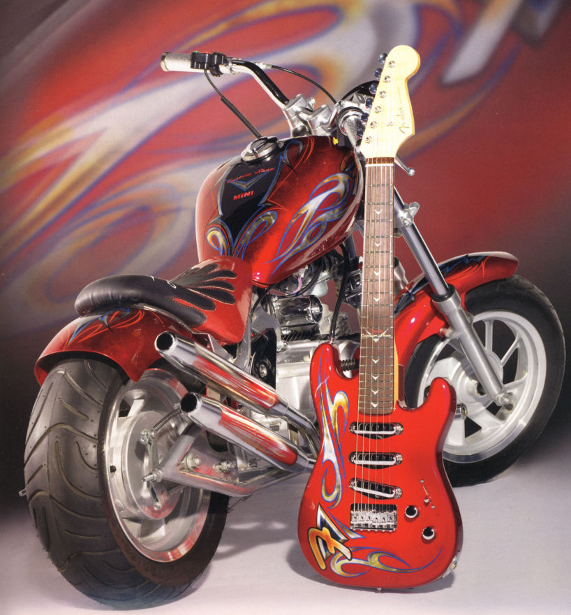 | Above photo credits: This picture was scanned from the 2002 Fender Custom Shop Calendar. It's published by Ronnie Sellers Productions. Check out the bibliography for more of these pictures in the "Fender Custom Shop Guitar Gallery" book! The pictures of the Strat-O-Cruiser were callously purloined from Totally Titan |