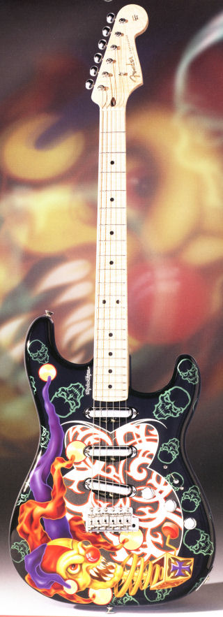| Remarks: This guitar was designed and painted by the So-Cal Speed Shop in cooperation with the Fender Custom Shop. It has custom-built pickups, custom knobs and pickguard, and a tremolo arm made from the turn lever knob of a 1949 Mercury. Click here for a detail of the headstock. |