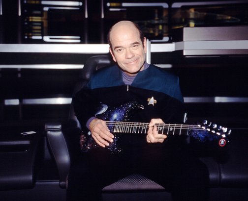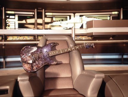 | Remarks: This guitar was first demonstrated at NAMM 2001, was conceived and painted by Dan Curry (Paramount's head of visual effects for "Star Trek Voyager"). It was hand-carved by George Amicay. Click here to see a picture of the guitar on the bridge of the Starship Enterprise. Click here to see a picture of the guitar in the hands of "The Doctor". |