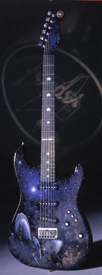 | Remarks: This guitar was built for the Summer 2005 NAMM show. The stars are made of white and yellow golf leaf. The bird's-eye maple neck is inlaid with an aluminium rocket with a "vapour trail". | ||