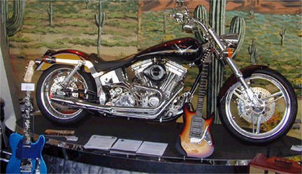 | Remarks: John Cruz thought of this set. He bought the mini bike, disassembled it, painted it and customized it. The small-scale guitar features a matching paint job. | ||