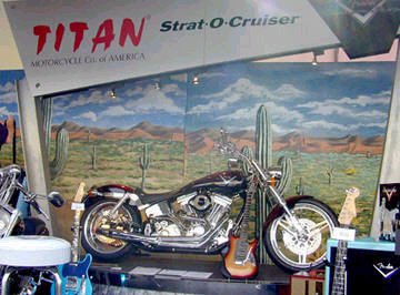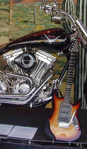 | Remarks: Built as a collaboration between Titan Motorcycles and Fender, by Alan Hamel. It features a padded armrest, clutch lever tremolo, machined pickguard and custom hex bolt inlays. There's a 'matching motorcycle' as well, the Strat-o-Cruiser. Click here, here and here for pictures of that. | ||