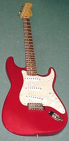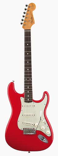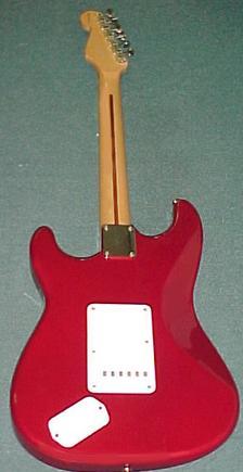 | Remarks: This colour is Hot Rod Red, a nitro-cellulose lacquer finish. The body is lightweight ash, contoured as in '57. It's got a '62's "C" shape maple neck, 21 nickel silver frets. It has 3 Texas Special pickups, 5-position switch, and Knopfler's signature decal on the ball of the headstock. | ||