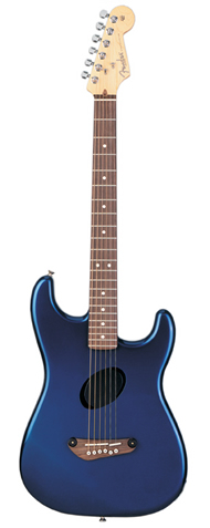 | Remarks: This seems to be the up-market model of the Stratacoustic. Alder body with graphite top, satin polyurethane finish (Saphire Blue Transparent (shown), Crimson Red Transparent, Ebony Transparent or Pewter). It has 3 In-Bridge Fishman Piezo Pickups. | ||