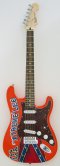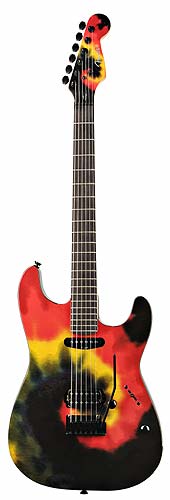 | Remarks: The retro tie-dye patterns that adorn these guitars are taken from real T-shirts. They have locking tuning machines, 22-fret neck, two-point tremolo and custom pickup configuration. The red/orange colour is "Band of Gypsys", the blue one is called "Hippie Blue". | ||