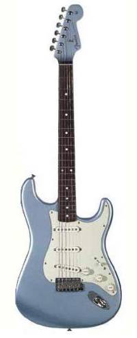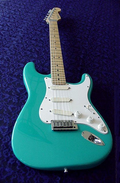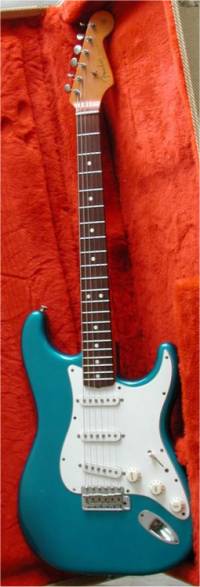| Remarks: This colour is 'Surf Pearl' (a 1957 DuPont Chevrolet color). (Perhaps) visible modification is that the tuners have been replaced by Fender/Schaller locking tuners (like on the Deluxe Strat). | ||