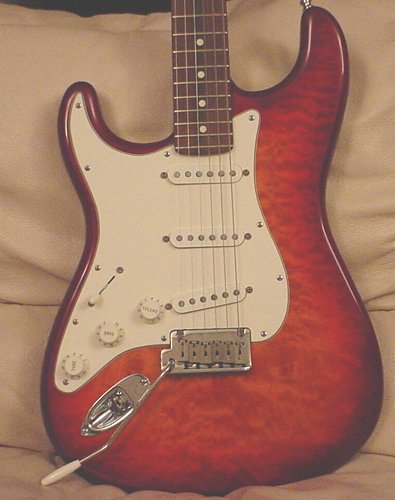 | Remarks: One of the new 2004 American Deluxe series instruments, this one features a Flame Maple Top in a beautiful Bing Cherry Transparent finish. | ||