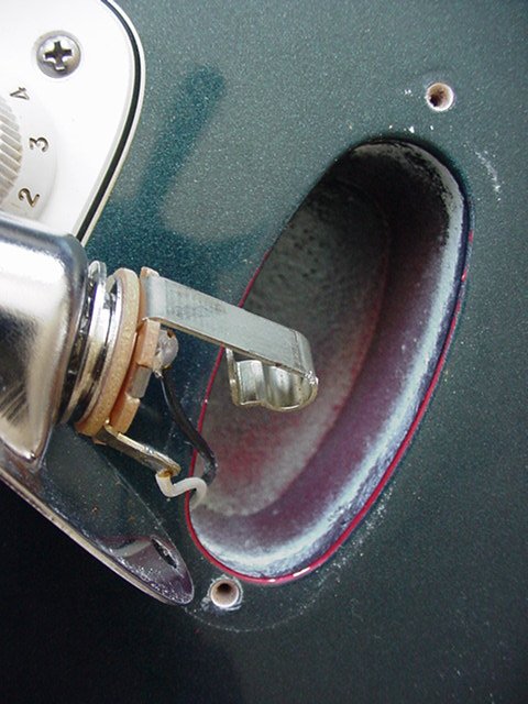 | Remarks: At first sight this seems to be a pretty regular Stratocaster, albeit in an odd 'gun metal' type finish. More careful investigation reveals it as a factory refinish. Originally it was Dakota, or Torrino Red. Check out the picture of the jack, with no paint in the drill holes and the red layer underneath. Oscar Pallares made the body (he works for the Custom Shop as a neck finisher now) and the neck was made by John Cruz (who works at the Custom Shop, too, now). | ||