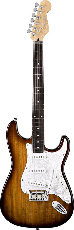 | Remarks: The Special Edition Koa Stratocaster guitar marks the first time that Fender has used exotic and highly sought-after koa wood in an instrument outside the Custom Shop models. The guitar features a koa veneer atop a basswood body, with a Light Burst Rosewood finish, modern C-shaped birds-eye maple neck, rosewood fingerboard, Seymour Duncan alnico Pro II pickups, a two-point synchronized tremolo, and pearl pickguard and dot inlays. | ||