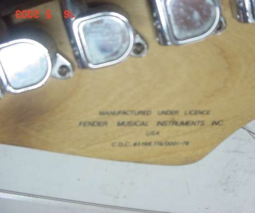 | Remarks: To those who are initiated in the topic, this serial number is totally off kilter. Although there is some discussion as to what the exact date of this guitar would be, there are three facts: The guitar was made in Korea, it is not from '79 (such as the regular Fender serial numbering system would imply) and it was made with US-made hardware. Now for some more information on dating this instrument. One source says these instruments adhere to the Fender Japan serial number scheme, in which case S+6 digits makes it a 1994-1995 guitar. Another source has a guitar much like it, took it apart and noticed it had a '85 neck date. And yet another source states that the "S" means that is was made in the Korean Samick factory, though he mentions the second character should be an "E" for eighties, "N" for nineties, etc. It seems the last of these systems is not applicable to this guitar on account of there not being a second non-numeral character. Until someone comes with a better explanation, I stick to the guy who took the neck off. | ||