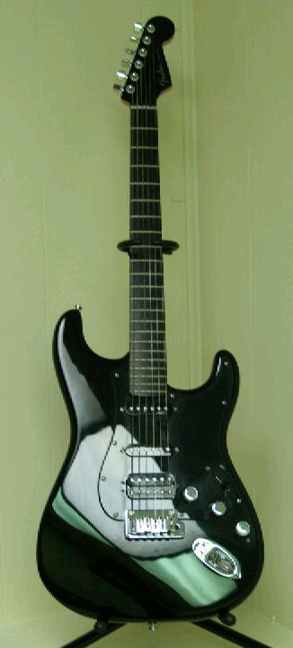 | Remarks: This guitar has no dots on the fretboard and has as much black as they wanted to use (unfortunately no black hardware). Pickups: 2 SCN and one Humbucker with black bobbins. Supposedly a limited run of 300 or less. Click here for another picture (of another NMB Strat). | ||