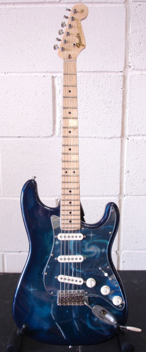 | Remarks: This guitar started life as a midnight blue Strat Plus. The rosewood neck was replaced by maple (serial number N4170946). Body was burned and frozen to age like Hendrix guitars. Then stripped and re-finished with psychedelic "space wallpaper" (like the Paisley and Floral Fender designs), sprayed with midnight blue mix and nitro-celluose matt lacquer. Also: aged Kluson deluxe heads, aged 60's style strat trem/bridge, aged jack cup, custom wound Lindy Fralin 7% overwound blues special pickups, aged pick up covers, original aged vol/tone/tone, clear scratchplate with 4 changable wallpaper inserts, 3 way switch with push 2nd/bottom tone pot for Tele/Gibson SG Special sound. | ||