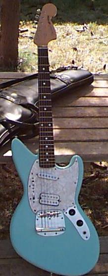 | The Jag-Stang was designed by the late Kurt Cobain of Nirvana. It's, basically, a cross between a the Jaguar and Mustang guitars. Arguably not the most aesthetically pleasing match, but there ya go. It used to be made exclusively by the US Fender Custom Shop (using a DiMarzio H-3 humbucker and a Fender Texas Special), but later got made in Japan. It's got a floating bridge, 22 frets, and each pickup has its own 3-position switch with one featuring an 'out of phase' mode. Maple neck, rosewood fingerboard. | |||