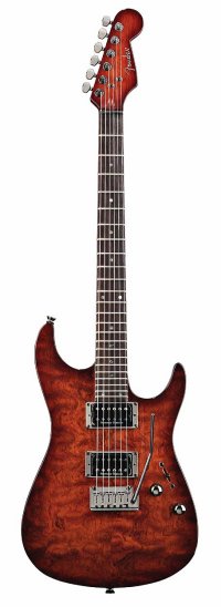 | Remarks: Alder body, figured maple carved top with scraped edges, set-in maple neck with abalone dot markers, rosewood fingerboard, Sperzel Trim-Lok tuners, LSR roller nut, two Fender "Fat 50's" single coil pickups and one Seymour Duncan '59 Trembucker, deluxe 2-point locking tremolo. | |||